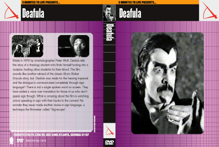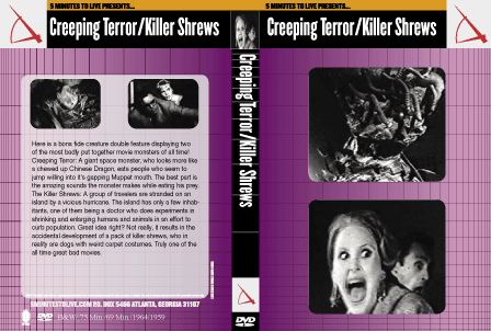 As per their disclaimer, 5 Minutes To Live “specializes in providing films lost to the public. The titles we sell are some of the best films we feel should be seen by any fan of extraordinary cinema … 5 Minutes to Live operates as a conversion service for fans of hard-to-find movies. Please note we do not sell factory release DVDs. All DVD-Rs are reproductions/conversions from public domain sources. No rights are given or implied.” Not sure what the heck “public domain sources” means, but all right.
