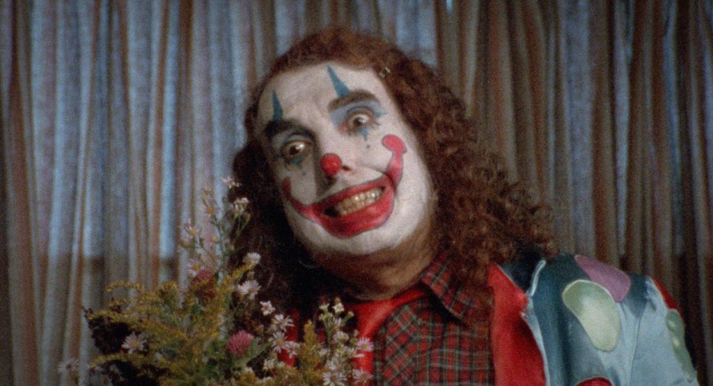 The novelty of this slasher film is the casting of the famous 15-minute celebrity, the ukulele-playing, off-key warbling, counterculture curiosity Tiny Tim, whom director Bill Rebane met at a 1985 Wisconsin “oldies” musical revue, and then began this project with Tiny Tim in mind. In this film, Tim plays Merv, whose psychological reaction to his parents’ death has him now wearing clown makeup, singing nursery rhymes and hymns. For the role of Merv, Tiny Tim more or less taps into his famous persona: the overgrown man child whose childlike singing and ukulele playing illustrates the juvenile trapped in an adult’s body. Merv, who now dubs himself The Marvelous Mervo, stopped growing psychologically after that trauma experienced during his youth, and is now cared for by his brother Gary (Dean West).
