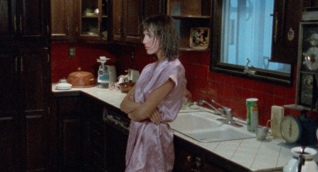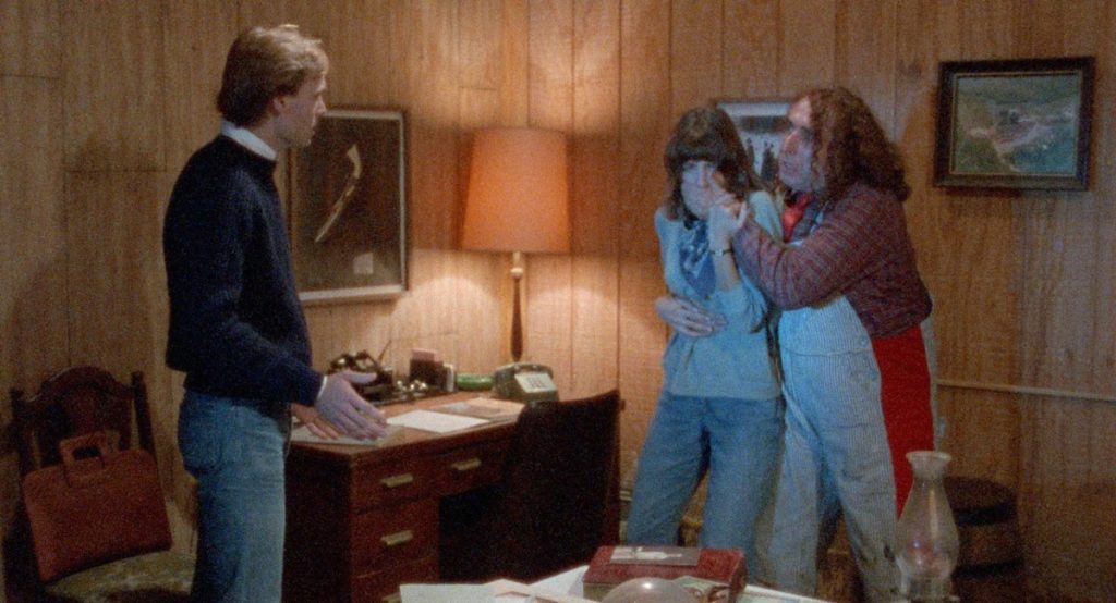 In this perverse look at Americana, there are also moments of black comedy, in such subtleties as the ineffectual sheriff who wears a baseball uniform under his police jacket, insinuating that he’d rather be pursuing a Great American pasttime than investigating threats against a person who isn’t liked by the community. What starts out as an effective mood piece eventually becomes a cat-and-mouse thriller. People who drop by Jill’s house eventually suffer the same fates as Merv’s parents of long ago: their throats are slit, and they bleed to death while suspended by rope in the nearby barn that, curiously, Jill never investigates. The film isn’t so much a whodunit (as one can easily pick out the killer’s identity early on), but more of a psychological game as Jill is being robbed of loved ones, much the same as people in the area have been robbed of something or someone cherished to them. And while the movie has completely given itself over to slasher conventions by the final third, and that the climax is about fifteen minutes too long, for a change we don’t mind as it is surprisingly well made.