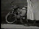 The only way to do this frenetic silent film any justice in print is to offer a play-by-play synopsis. Opening with some jaunty music and a title card: “Dedicated to the Laugh Makers of Long Ago…”, we are introduced to our hero, The Goof (played by Bert Leu Van), an offshoot of silent film clowns, wearing a small porkpie hat, holding a parasol in one hand and steering a bicycle with the other. A car knocks over a box in an alleyway, and underneath is revealed The Drunkard (played by Rick Dennis, who would have a bit part in Steckler’s first feature, Wild Guitar), with his trademark backward baseball cap. The Goof parks his bike (a wolf sound is heard on the soundtrack), climbs over The Drunkard, and over a wall. He ogles at a woman in a swimsuit being photographed next to a backyard swimming pool. Also present at the scene is this floppy-hatted something, perhaps an early forerunner of one of Steckler’s Incredibly Strange Creatures, which the smitten Goof hops over. Meanwhile, outside, a strange zombie-like Grandma in a nightgown and nightcap walks past The Drunkard. He opens the gate to the same backyard (an alarm sounds), and a cut-in to a hand-scrawled sign reveals this location to be “Mrs. Bait’s Home For the Fruity”. The Goof cuts a flower. Grandma sits by the pool in patio furniture across from someone wearing a Frankenstein Monster mask and smoking a cigarette. A guy fishes off the diving board. The girl kisses The Goof. The cameraman goes into the pool with a bag on his head, and tosses his exposed film into the water. A guy with an arrow through his hat looks on. The Drunkard crawls in the entrance. The girl’s kiss stops. The Drunkard comes to the patio and dances with Grandma. The cameraman examines the rushes of his film while still standing in the pool. The Goof leaves. The girl jumps in the pool and a fish hook gets caught on her suit. The guy with the arrow through the hat laughs.