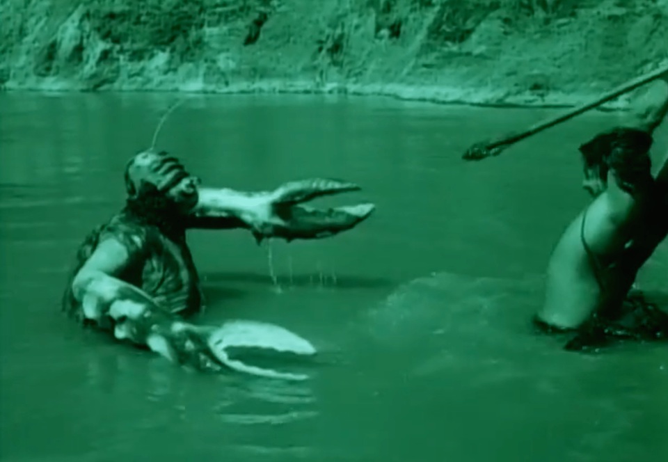 Once the astronauts go on the planet surface, they react to all the offscreen footage of Tagani, which is presented in tints of red, green or sepia, because the caveman movie was shot in black and white. The gels are explained away by stating that the planet is infected by radiation. This babble is given credence because the good Tagani tribe endlessly battles with the Tubata tribe, who all wear these silly vampire fangs, thus supporting Carradine’s theory of the mutations on the planet. (Mind you, the bat-people who fly around in the caverns are pretty cool.) And if that’s not enough, modern-day actors react to cut-ins of stuff a generation or two older: dinosaurs from Willis O’Brien’s 1925 The Lost World, and lizards fighting from One Million B.C. by way of Robot Monster! Now that’s plunder!