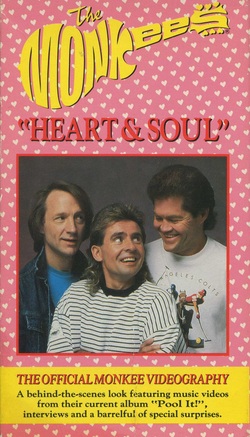 The boundaries between music videos created primarily for promotional purposes and those in the above-detailed categories tend to blur in most cases, but certain tapes do tend to fall more into this description. Of all music-related product, promotional tapes have the shortest shelf life, and usually the least to offer in terms of significant content. The bulk of promotional videos never even reach the general public – they are produced by record companies for circulation to the media and within the industry to bring attention to an artist or a new release. Promo videos could be anything from a quickly dubbed copy of a single music video, to a hastily assembled interview tape or an artist profile. Some promotional tapes have made it onto the market, often as free giveaways, and occasionally for purchase. Another dusty VHS tape unearthed by ESR’s editor and brought to my attention is a suitable candidate for inclusion in this category: Rhino Video’s The Monkees “Heart & Soul”. Billed on the cover as “The Official Monkee Videography”, Heart & Soul is in reality a 40-minute hodgepodge of a tape, put out in 1988 to help promote the group’s “comeback” album, Pool It! (deemed by the All Music Guide as “Unquestionably their worst output of all time”). While only three of the original “pre-fab four” show up for the festivities, Heart & Soul attempts to rekindle interest in The Monkees with a mix of contemporary interviews, lame concert footage, nostalgic flashback material (including Rice Krispie commercials from the 60s), and a couple of new music videos for songs from Pool It!, most of which are forgettable to embarrassing. A vaguely enjoyable watch for the hardcore Monkees fan maybe, but Heart & Soul just left me pining for the original series (or another viewing of Head). Ultimately, the bulk of promotional videos are disposable, for completists only.
