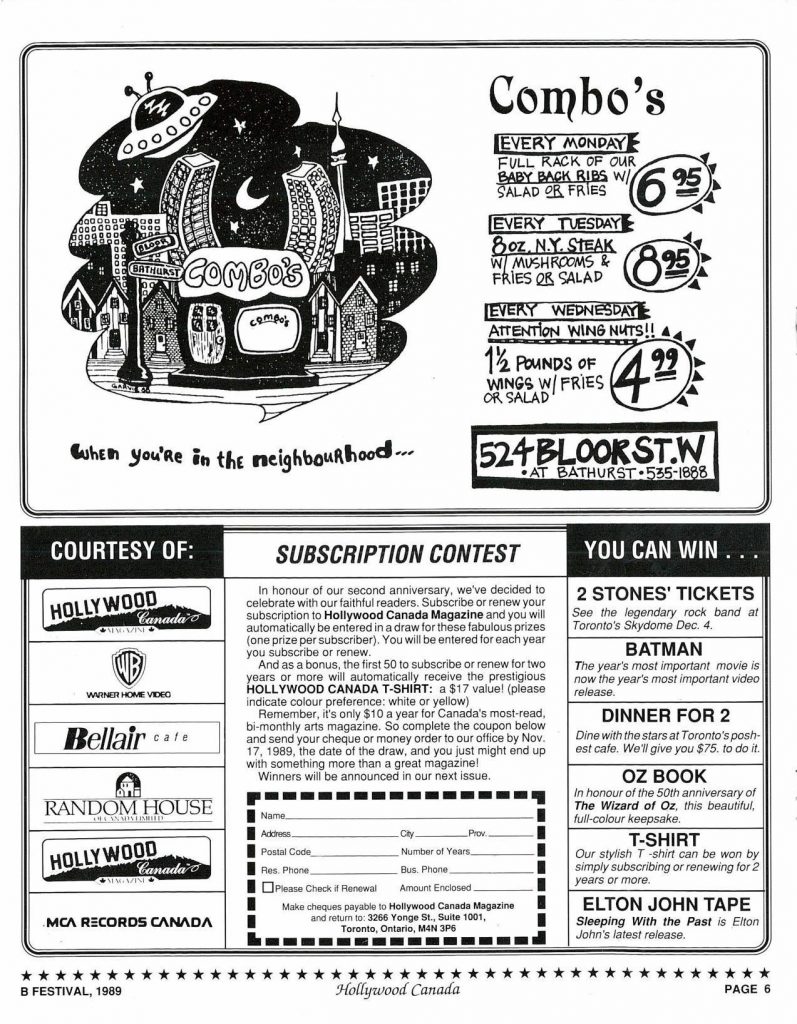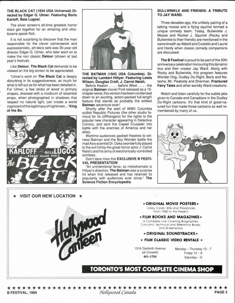 From the mid 1980s to the early 1990s, Toronto’s fabled Bloor Cinema would run its annual B Festival for (usually) one week every October. Below is the program guide for the 4th Annual B Fest, in October 1989. This souvenir has a special resonance for me, because that fall I had ventured to the big city for school, and on the side was immersing myself into however much film culture I could. I spent a wonderful Sunday seeing the 1949 Batman and Robin condensed serial (the program lists the 1943 serial instead), and Dracula Has Risen from the Grave. This cemented my love of Toronto’s rep cinemas, in which I had spent untold evenings and weekend matinees.