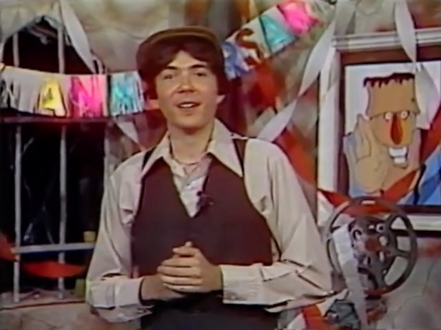 “Although it shared a lot of the trappings of other horror shows (including a really funky orange and yellow dungeon set) it had a sensibility all its own. Jim didn’t wear fright makeup or a costume. He was just a “regular guy” laughing at the movies with the audience (Oh yea… and hawking lots of pizza! Pizza Hut was the main sponsor). The double feature show was broadcast live and featured a really crazy cast of guest stars. The theme music was “Night on Disco Mountain” from the Saturday Night Fever soundtrack. The closing music was a really screwed up version of “Ding Dong The Witch Is Dead” from a kiddy novelty album. SIR ROBERT GHOUL-LEY, a more traditional type of host in makeup, filled in when Jim was away. In 1982 the show was replaced by syndicated episodes of Elvira’s Movie Macabre.”